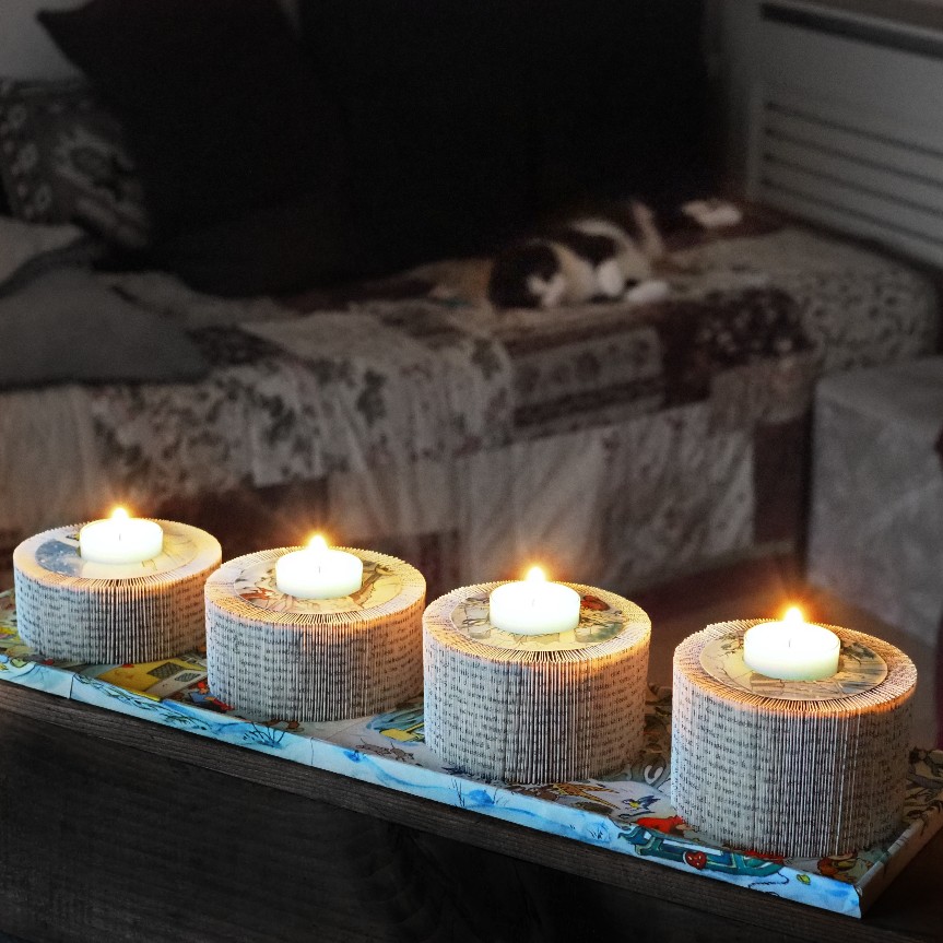 Am Abend entsteht dadurch ein wunderbarer Effekt. Die Buchseiten werden beleuchtet und die Buchstaben beginnen im Schein der Kerze zu tanzen.