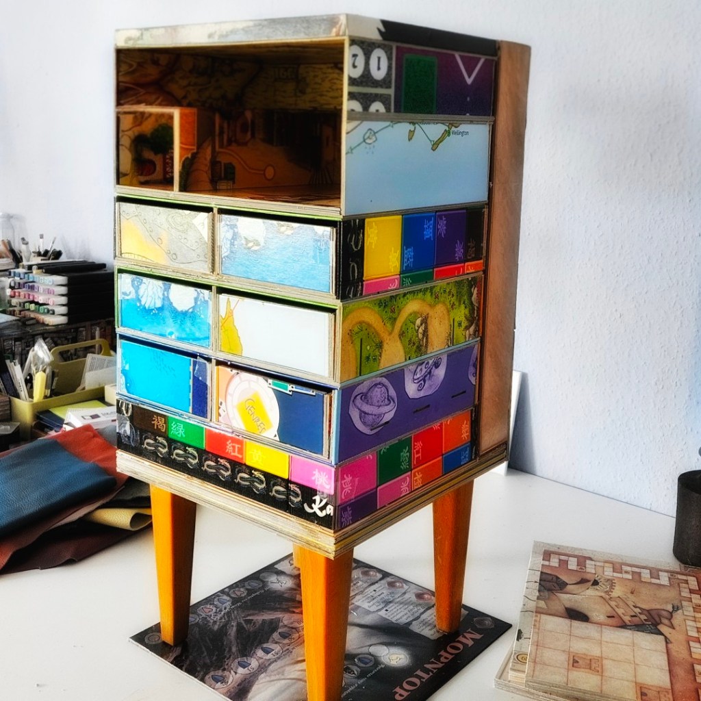Das Innere der 6 Schubladen ist ein buntes Mosaik aus verschiedenen, bekannten und unbekannten Spielen. Die Kanten der Schubladen habe ich unbehandelt gelassen, um sichtbar zu machen, dass es sich nicht um Holz handelt, das mit Papier überzogen ist, sondern um authentische Spielbretter.